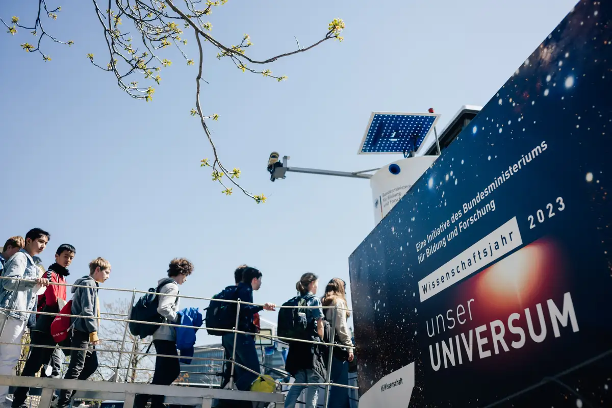 Schüler*innen gehen über einen Steg aufs Schiff. Rechts ist das Logo des Wissenschaftsjahres auf dem Schiff zu sehen.