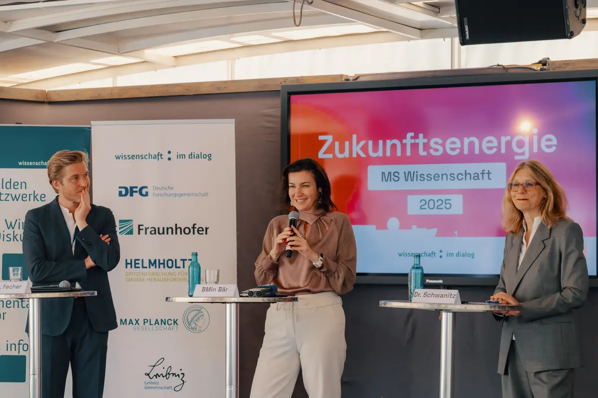 Dorothee Bär, Bundesministerin für Forschung, Technologie und Raumfahrt eröffnete die Ausstellung zum Thema Zukunftsenergie. Mit auf dem Podium: Dr. Simone Schwanitz, Generalsekretärin der Max-Planck-Gesellschaft und Vorsitzende der Gesellschafterversammlung von Wissenschaft im Dialog und Dr. Benedikt Fecher, Geschäftsführer von Wissenschaft im Dialog.